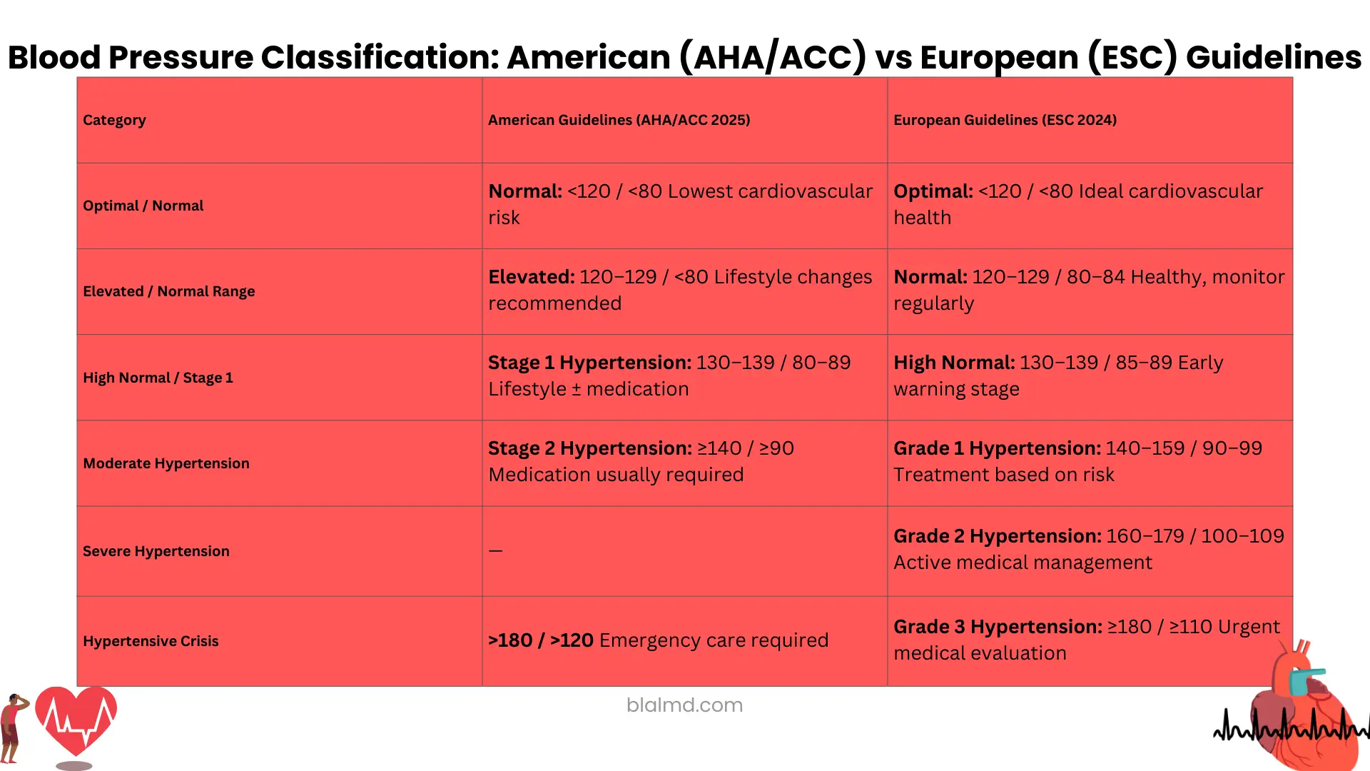 Blood pressure categories differ slightly between American and European guidelines. Here’s a detailed comparison:
